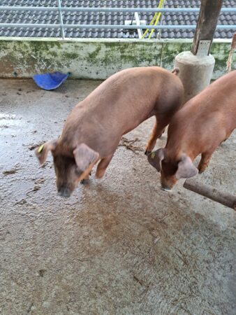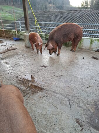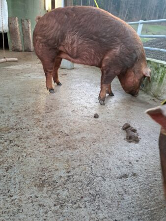 Das grossrahmige Duroc-Schwein ist einfarbig und hat eine hell-rote bis rotbraune Färbung. Es ist eine frohwüchsige, stress-resistente und sehr gutmütige Rasse mit Schlappohren. Das Fleisch ist gleichmässig mit feinen Fettäderchen durchzogen. Dieser hohe Anteil an intramuskulärem Fett macht es äusserst saftig und zart. Unsere Schweine füttern wir mit speziellem Kräuterfutter. Dieses hinterlässt in den sogenannten Kräuterschweinen Fleisch und insbesondere Fett von höchster Qualität. Da wir nur ca. jährige Schweine schlachten wiegt ein Schweinskotelett bei uns zwischen 0.9 und 1.3 kg – ein sogenanntes XXL Schweinskotelett.